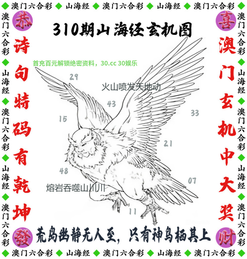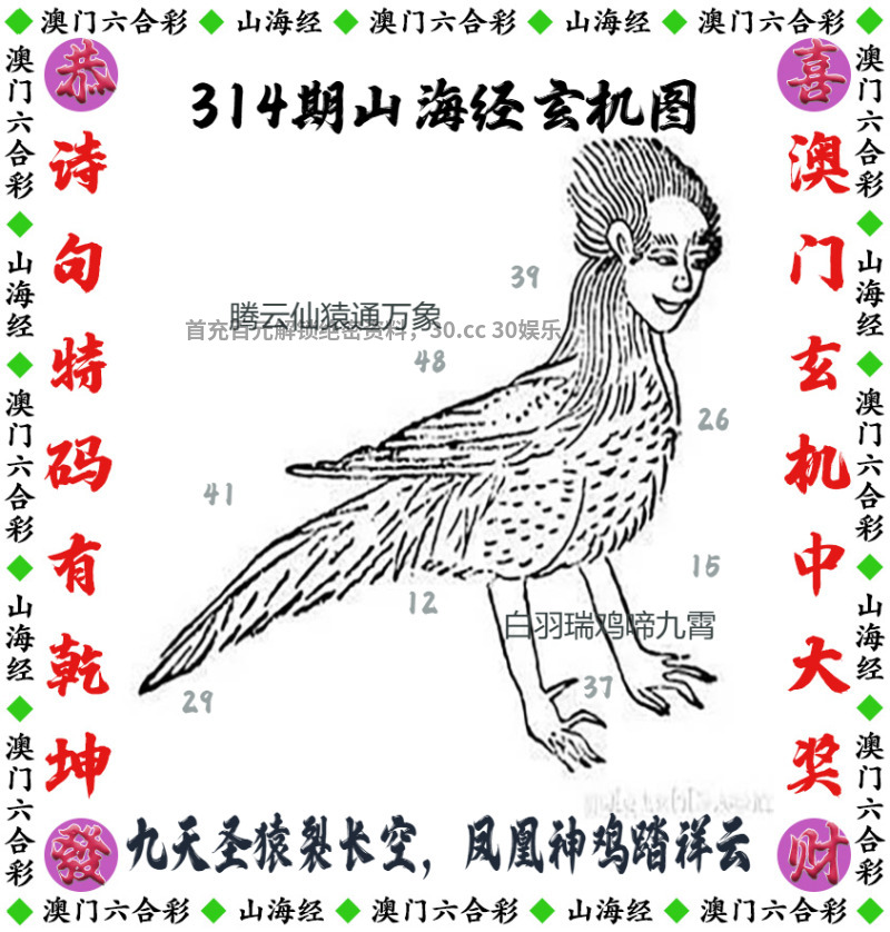 314期:【山海经玄机】开羊23 解释:腾云仙猿通万象,白羽瑞鸡啼九霄解牛鸡狗 解料:九天圣猿裂长空,凤凰神鸡踏祥云解马羊猪 综合:牛马羊猪鸡狗 主特:29.41.12.48.11.23.31.43.21.33.32.44 |